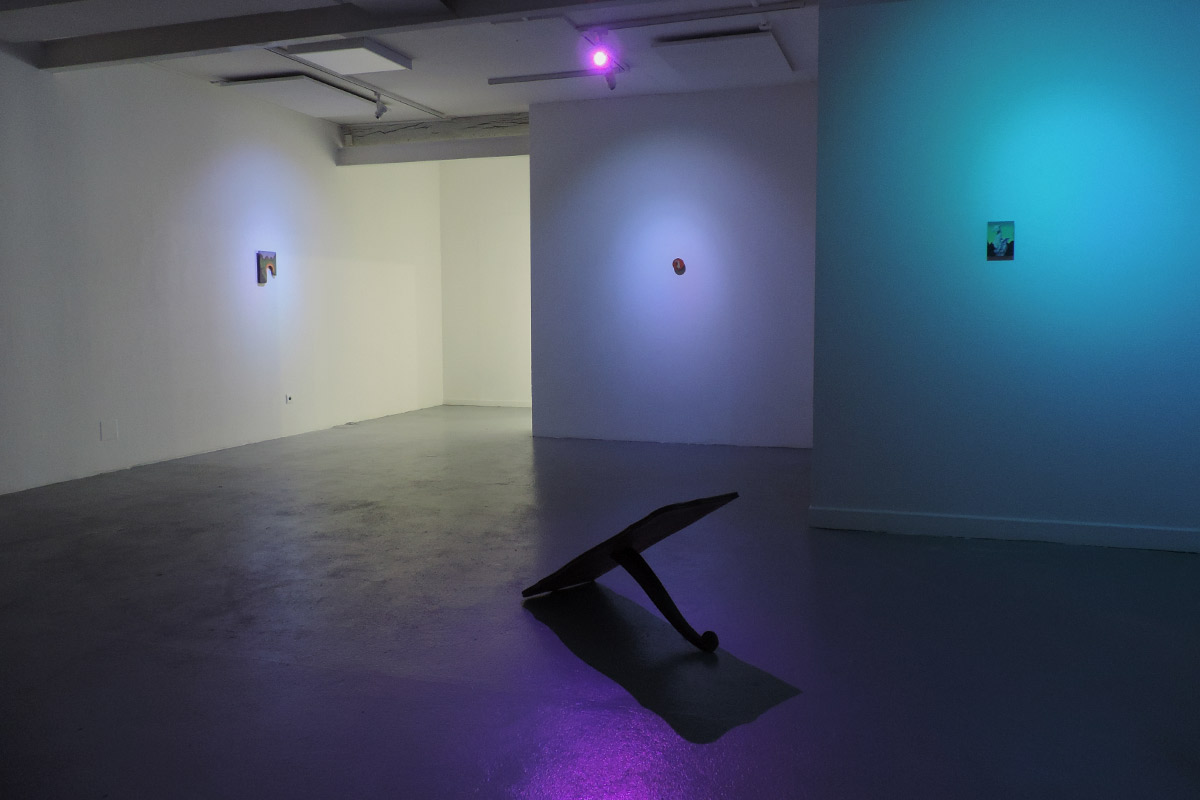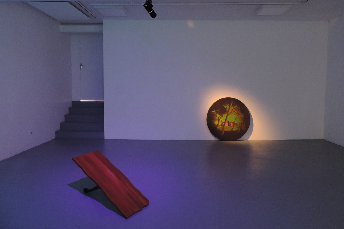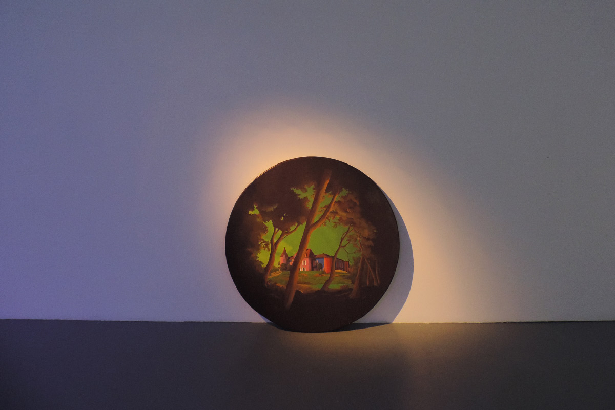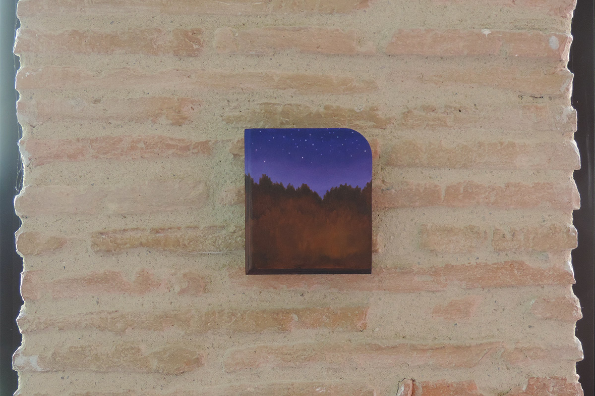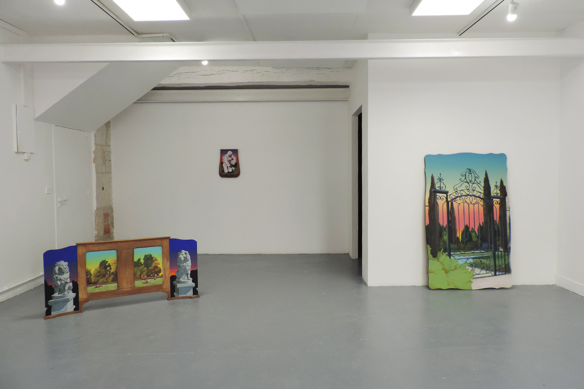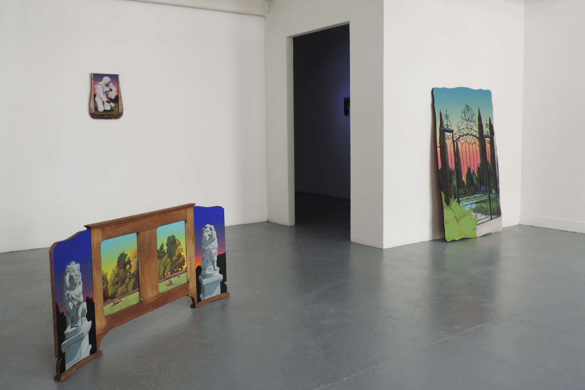 La plupart se déroulent au crépuscule. C’est un moment de transition, un espace d’incertitudes. Il marque la fin d’une journée, mais aussi l’évidence de l’avènement d’une autre. Il donne forme au passage entre le jour et la nuit, à la frontière entre la vie et la mort, entre le connu et l’inconnu, entre le visible et l’invisible. L’espace de la peinture permet de faire s’entrechoquer et dialoguer des signes et des images, de jouer avec les registres, de faire entrer dans l’espace d’exposition des objets parfois grotesques,