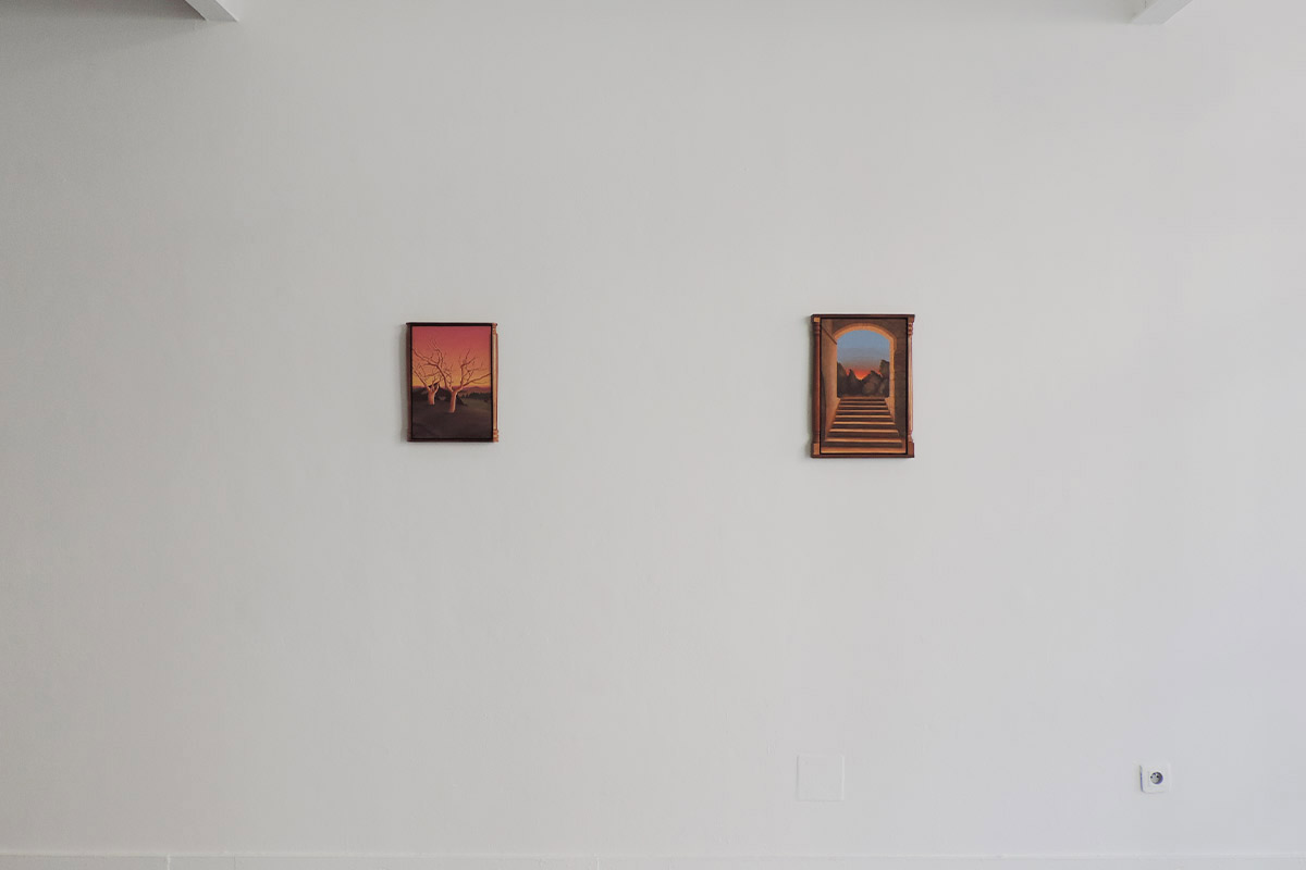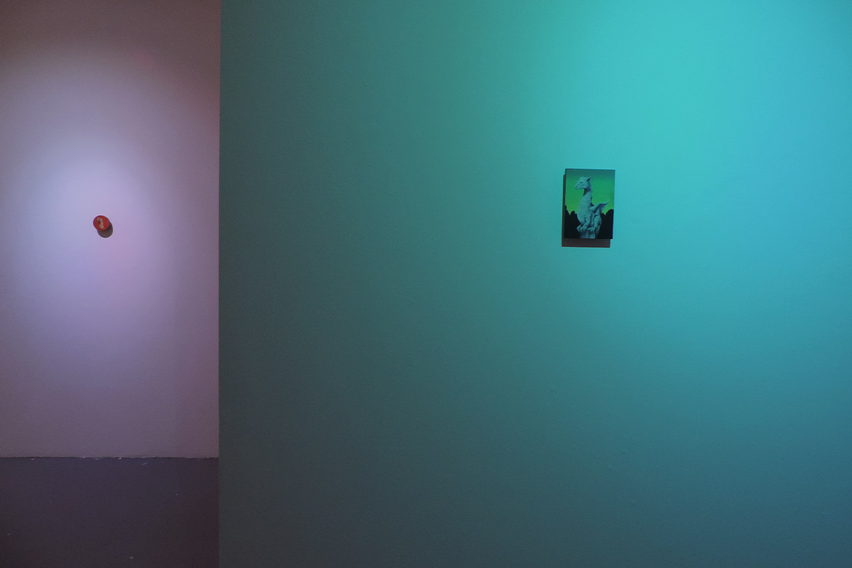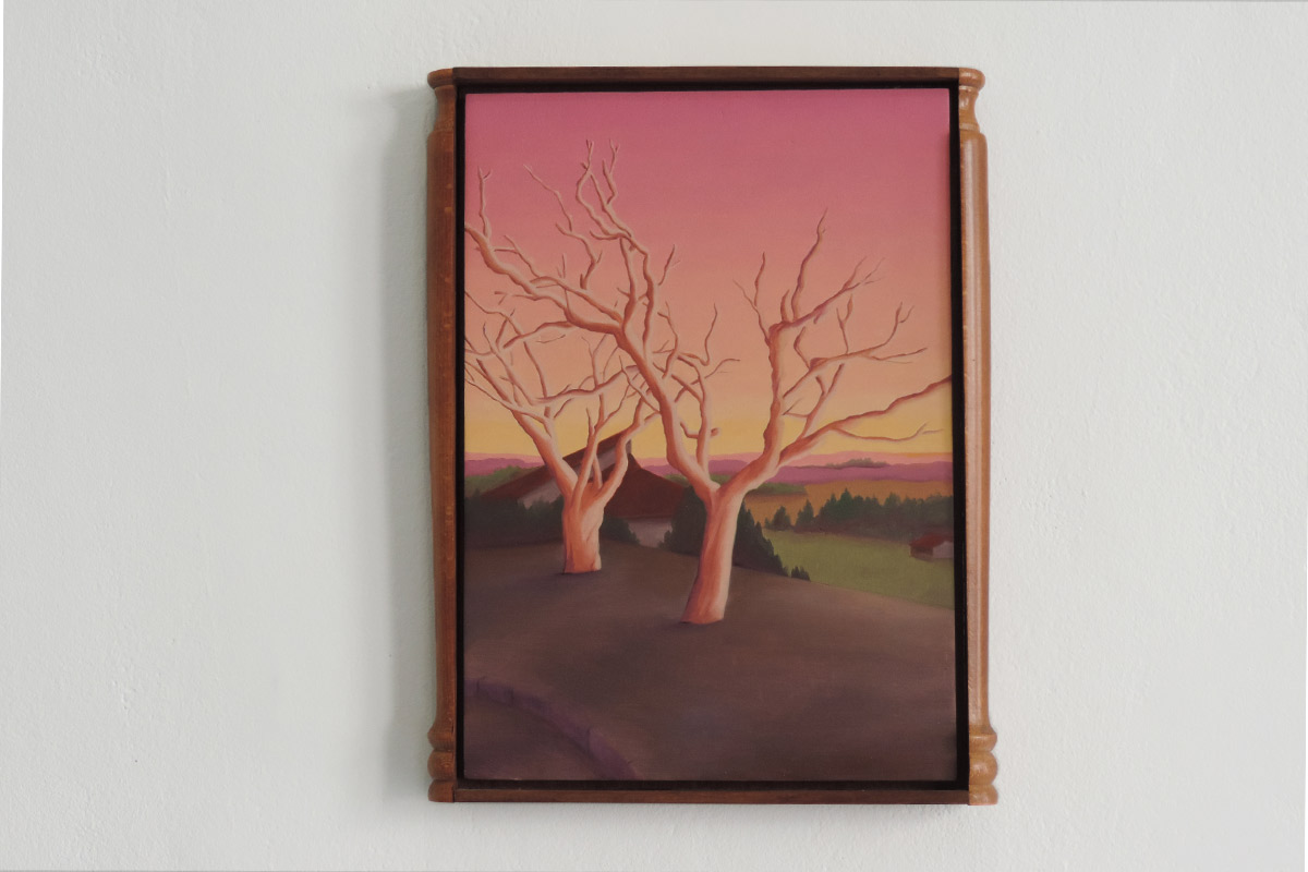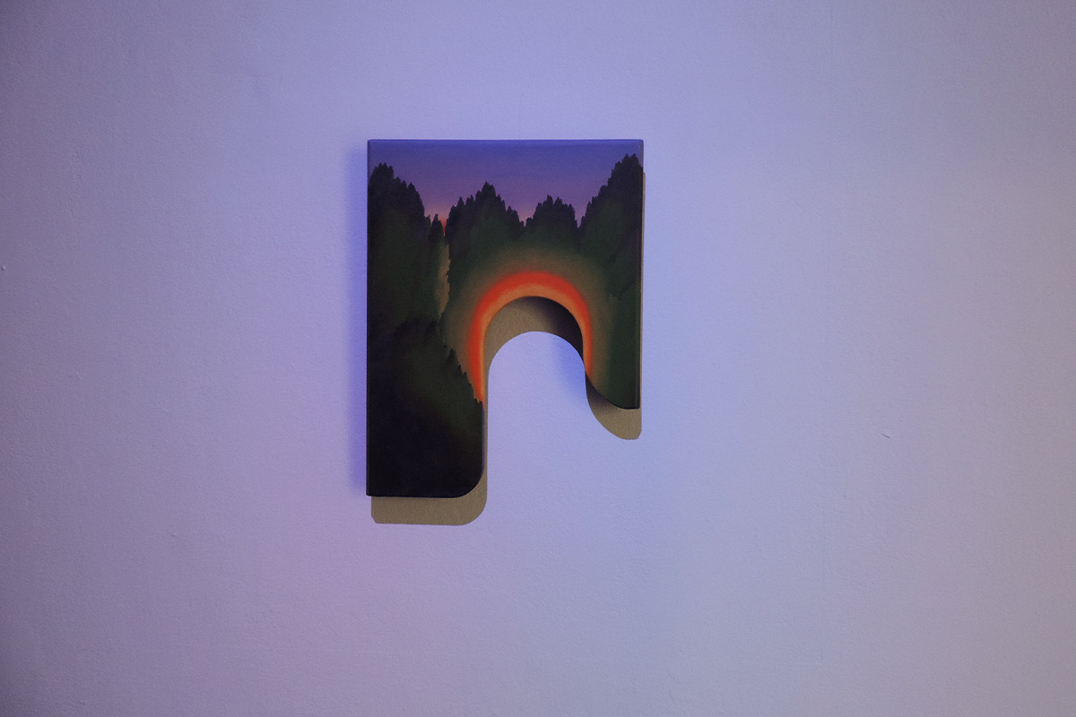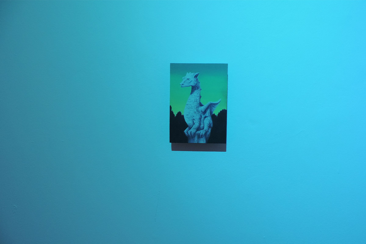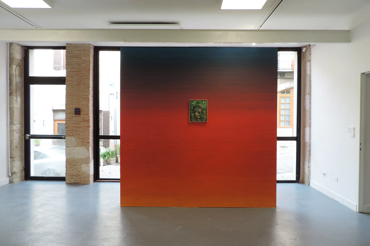 La plupart se déroulent au crépuscule. C’est un moment de transition, un espace d’incertitudes. Il marque la fin d’une journée, mais aussi l’évidence de l’avènement d’une autre. Il donne forme au passage entre le jour et la nuit, à la frontière entre la vie et la mort, entre le connu et l’inconnu, entre le visible et l’invisible. L’espace de la peinture permet de faire s’entrechoquer et dialoguer des signes et des images, de jouer avec les registres, de faire entrer dans l’espace d’exposition des objets parfois grotesques,